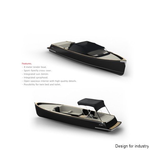 Cooper Yacht design for a tender speedboat, 8,5 meters long. the design focuse was on a cross-over boat for family and sports utility. the boat was presented on several tradeshows such as the HISWA boating show and the gerona boating show. With bimini and Cap Image 4 of 4